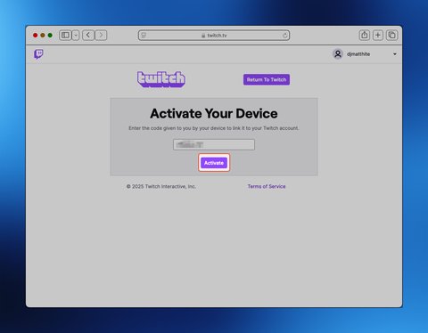 Please visit: https://www.twitch.tv/activate?device-code=<REDACTED>