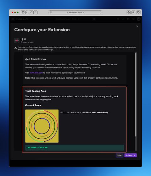 You will then be presented with a “Configure your Extension” screen. This screen contains an area labeled “Track Testing Area” which will contain album art and track information sent from djctl. It will allow you to test connectivity before going live on your stream.